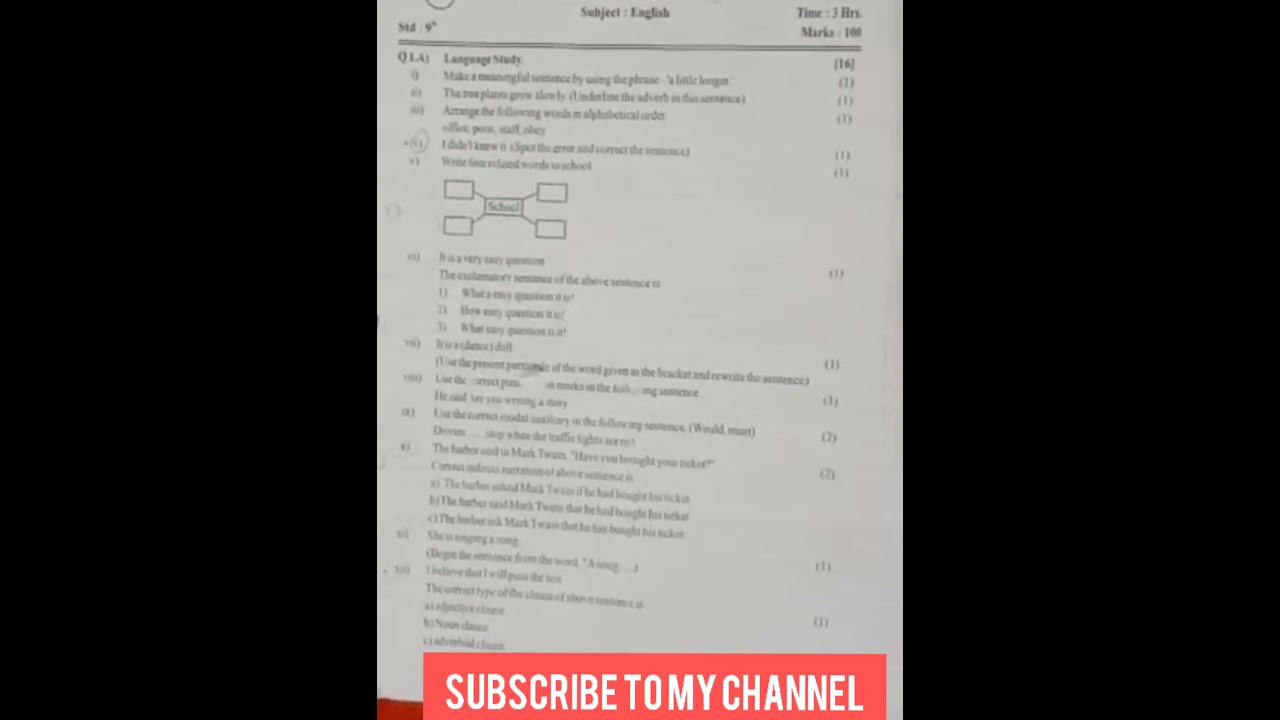 9 Th First Term Exam 2021 22 Subject English Question Paper Youtube